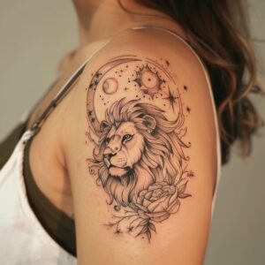 A lion with a rose is one of the most meaningful Leo Zodiac Tattoos Design Ideas, representing a powerful balance of strength and gentleness. This design is perfect for those who are bold and fearless, yet also compassionate and kind at heart.